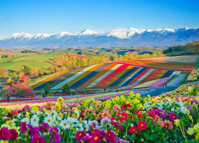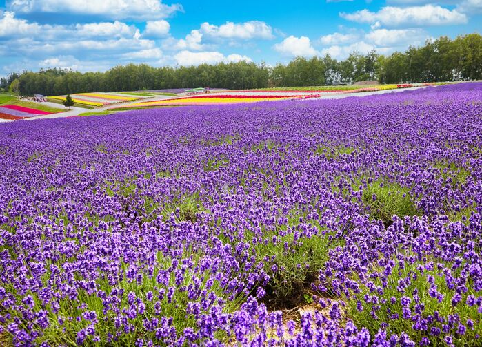 Vi reiser fra Sapporo til Furano (ca. 3 t med buss via Biei). Tokachibergen danner bakteppet for endeløse rader av lavendel, ringblomster, solroser og blå salvia. I slutten av juli står lavendelen i toppblomst – duften fyller luften, og landskapet er en fargesprakende mosaikk. Besøk Farm Tomita for gårdsbesøk, lavendelglass og utsikt over de velstelte feltene. Furano ble udødeliggjort av TV-serien Kita no Kuni kara, og de originale innspillingsstedene er nå små museer som tiltrekker nostalgiske reisende. [F–L]