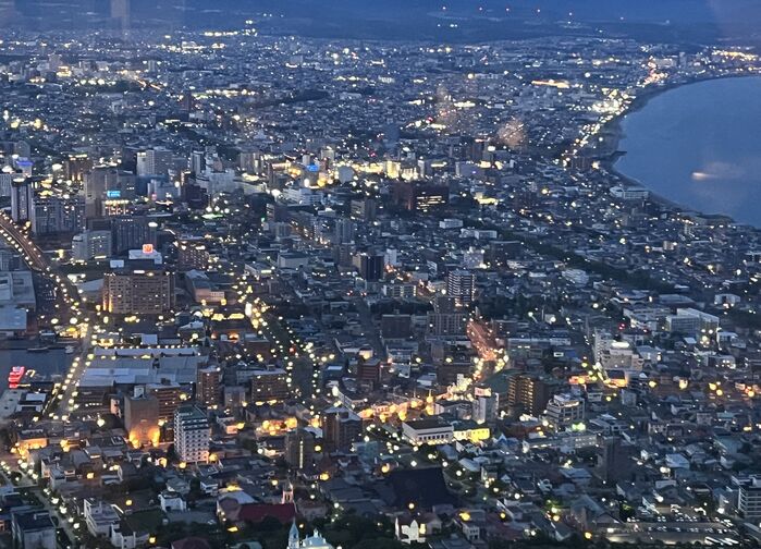Senere på kvelden kan man ta taubanen opp til fjellet Hakodate på egen hånd. Det er en vakker spasertur opp bakken til taubanestasjonen, hvor man får oppleve litt av Hakodates internasjonale arv med ulike typer kirker underveis. Fra toppen har man fantastisk panoramautsikt over byen når lysene tennes og man ser hav og bukt på hver side av det opplyste bybildet.