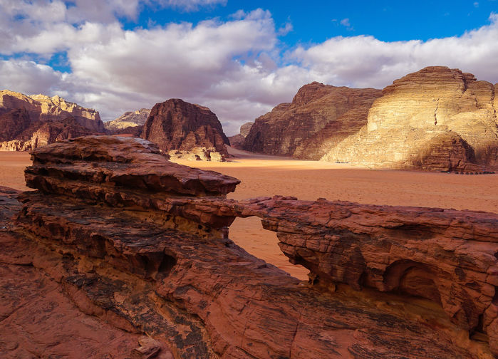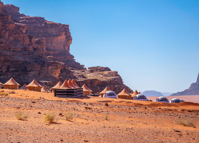 Vi forlater Petra og reiser til Wadi Rum, den største av Jordans wadier og den mest berømte i moderne tid, ikke minst fra filmene Lawrence of Arabia og The Martian. Landskapet er virkelig marsiansk med sin røde ørkensand og sandsteinsklipper. Dette området var også bebodd av de tidlige nabateerne, og mange veggmalerier vitner om jakt. I dag bor det bare beduiner her, og området har blitt et populært turistmål. Ved Wadi Rum-senteret fortsetter reisen med jeep inn i ørkenen. Kjøretiden er ca. 2 timer. Vi stopper for lunsj på et beskyttet sted. Jeepen fortsetter med bagasjen mens fotturen begynner og varer i ca. 4 timer til vi når teltleiren vår. Overnatting i Wadi Rum. Om kvelden spiser vi middag omgitt av fjellformasjoner. Frokost, lunsj og middag er inkludert.