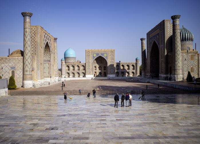 Dagen innledes ved Registan, byens historiske hjerte. Plassen omgis av tre praktfulle madrasaer som gjennom flere århundrer fungerte som religiøse skoler og utdanningsinstitusjoner. Hit kom studenter fra hele Sentral-Asia for å studere teologi, matematikk og filosofi. Bygningenes mosaikker, portaler og kupler viser tydelig det kunstneriske og tekniske nivået som ble nådd under Timuridenes storhetstid.