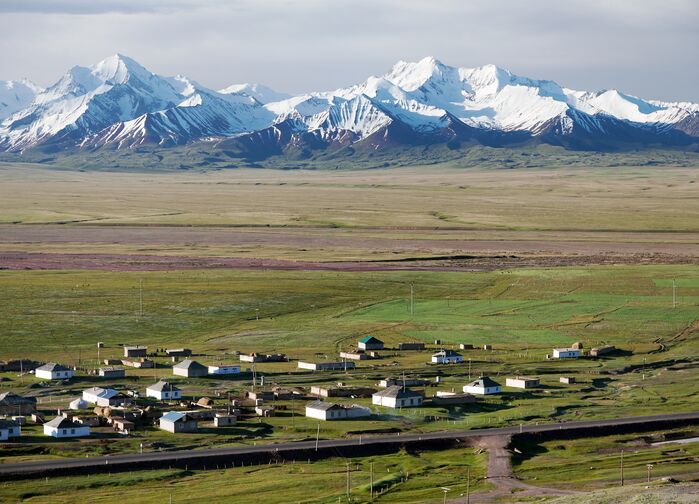 Ferden fortsetter inn i Kirgisistans høyland, der veiene går gjennom brede daler og åpne beitemarker med Pamirfjellenes mektige fjellkjeder i bakgrunnen. Her har reiser alltid måttet tilpasses terrenget. Avstandene er store og bosettingene få. Veiene følger dalfører som i generasjoner har vært brukt av gjetere og handelsreisende. Snødekte topper skimtes i det fjerne, og landskapet preges av høyde, lys og vidder snarere enn bymiljøer.