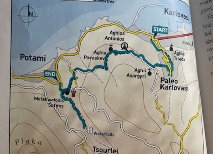 Vandringen tar utgangspunkt i Karlovassis eldre deler, der steinhus og smale smug vitner om tidligere epoker. Stier leder videre gjennom furuskog og forbi et lite kapell med utsyn over dalene. Ferden fortsetter mot landsbyene Leka og Tsourlei, der terrenget åpner seg mot havet. Nedstigningen mot kysten går gjennom solrike skråninger der urter trives og ofte samles til tørking. Dagen avsluttes ved stranden. [F.L.M]