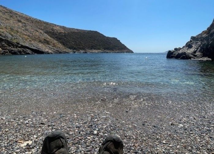Dagens vandring følger kystlandskapet sørvest på Samos, med Kerkis-massivet stadig til stede i bakgrunnen. Stien passerer Paleochori, i stor grad forlatt, og fortsetter mot mer åpent klippeterreng med utsyn mot øyene Fourni og Ikaria. Langs høydene ses ofte eleonorafalker på jakt. Klosteret Agios Ioannis ligger i et hagepreget område som gradvis har kommet seg etter en tidligere brann. Kirken står fortsatt, og området byr på både skygge og nærhet til en liten strand med klart vann. [F.L]