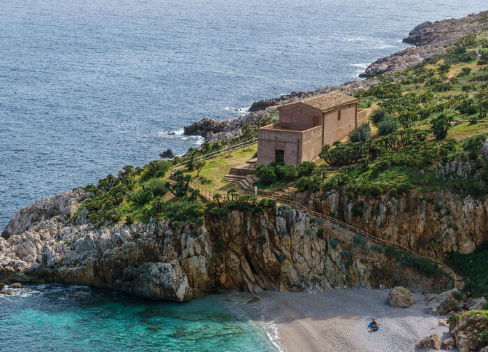 På vei til vandringens startpunkt gjør vi et fotostopp over de berømte Faraglioni-klippene ved den gamle tonnaraen i Scopello. Her møter havet Sicilias dramatiske kystlandskap.